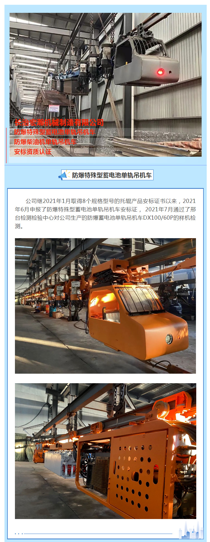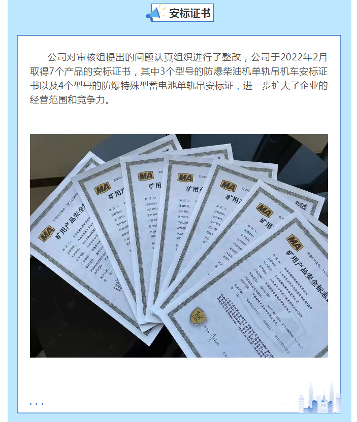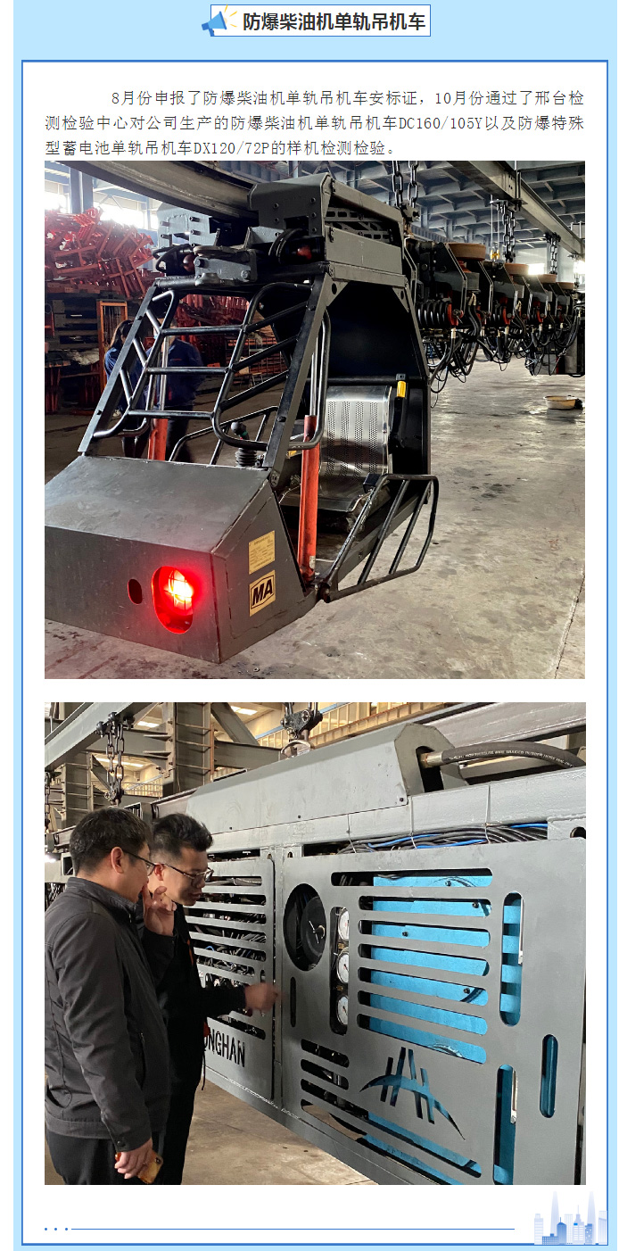 賀:長治宏瀚機(jī)械有限公司取得7個(gè)單軌吊機(jī)車產(chǎn)品的安標(biāo)證書